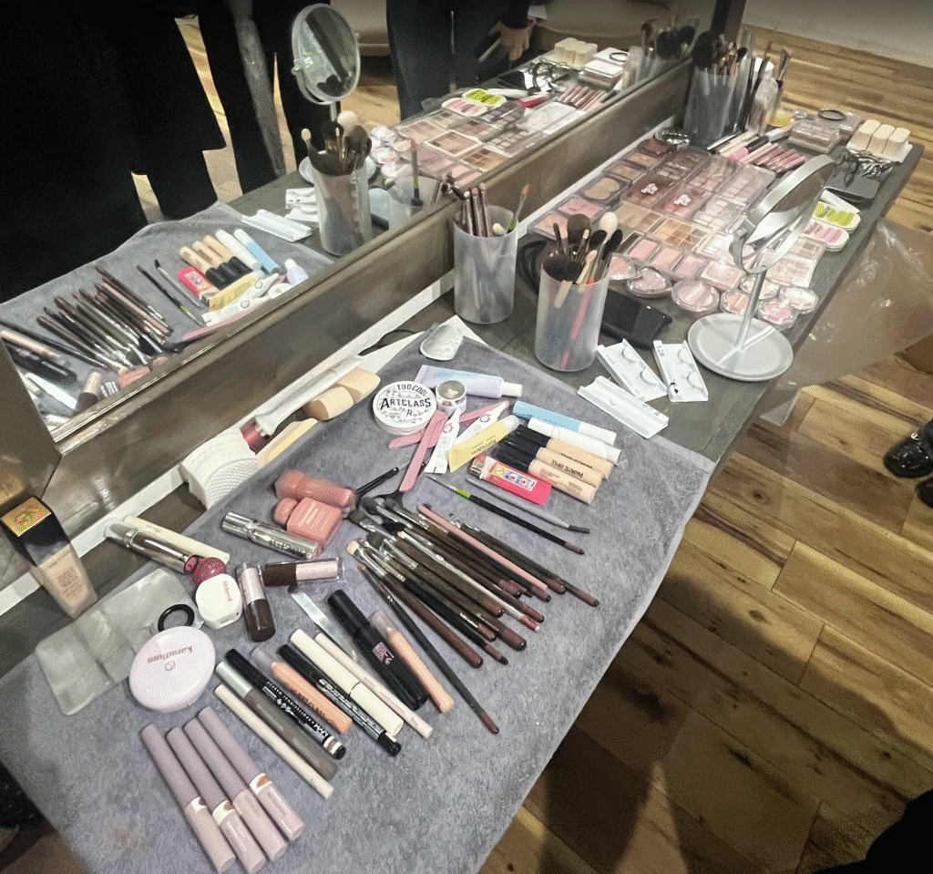 大きなテーブルが2つあり、各5人ずつ座ります。テーブルに今日使うブラシと、プレゼントのコスメが人数分置いてありました。